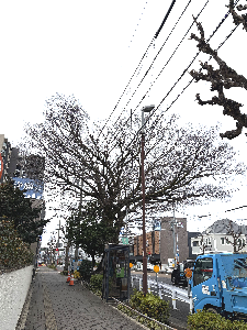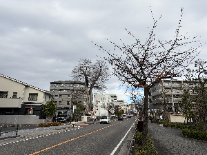 「文化のみち二葉館」の前から見たところ。手前の街路樹はオオカンザクラと思われる。この通りは「オオカンザクラの並木道」と呼ばれており、約130本のサクラが植えられているという。昭和36年に最初に植えられた16本のオオカンザクラのうち6本が生き残っているそうだ(東区公式ホームページ)。 |