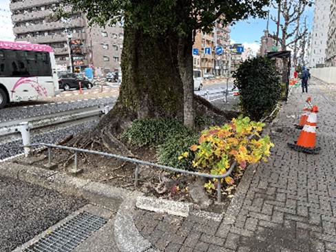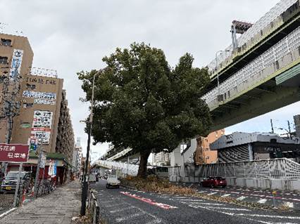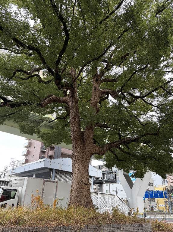 橦木町の(東片端の)クスノキ 名古屋市東区橦木町二丁目 ここで紹介するのは3回目。『樹木医が教える 緑化樹木事典』に載っている道路上のクスノキの写真もこの樹。国道41号の北行き車線の真ん中に立つクスノキについて昭和59年刊行の『生きている文化財 名古屋の名木』(以下『名木』)には「昭和40年頃より国道41号線の拡張のため、この樹が障害となり除去される運命にあった。地元学区の代表者などが、たびたび保存の陳情をしたが、その要望も空しく伐採の運命が迫った。このことが昭和42年1、2月頃新聞紙上を賑わした。当時の市長杉戸清氏は現地を視察して鶴の一声で保存することが決定したという。」と書かれている。その後の都市高速の建設からも生き延びた。都市高速はクスノキを避けて上下線二段構造になっている。歩道から見る限り、どこにも目立った傷は見られず、いたって健全そうである。『名木』ではこの近く南行き車線に接して立つイチョウの木も紹介され幹回り2.53m樹高18mとされている。 |