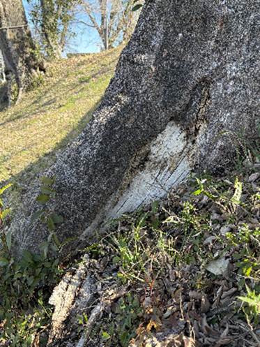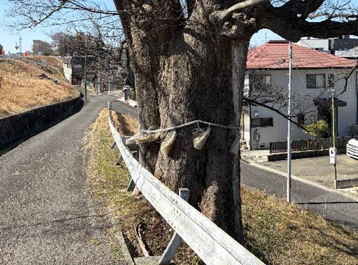 星神社のムクノキ 名古屋市西区山田町上小田井東古川 星神社の参道の傍となる堤防法面に5本のムクノキがある。そのうちの1本が最も太く堤防道路から降る道に接して立つ。幹が太りガードレールに接触している。周囲は草地。 根元には一ヶ所大きな開口空洞がある。また、法面下方に向かう根張りに大きな樹皮欠損がある。ムクノキで時折見かけるニレサルノコシカケは見られない。そのほかのキノコも根元や幹にはない。進行中の腐朽はないのかもしれない。幹には大枝が複数分岐する上端部付近で比較的大きな枝抜け痕の腐朽や空洞が生じているが、概して閉塞に向かいつつある。幹から分岐した大枝にはあちこちに比較的大きな傷が目立つ。見回すと傷だらけという印象である。枯下がった大枝も見られる。接する道路が舗装されたのは見たところ数十年前と思われ、その時の根の切断により幹上部に枝抜け跡を残す大枝の衰退を招いたか。ガードレールの支柱基礎の設置の際にも、多くの根が切断された可能性が高い。根を避けて基礎を設置するなどという配慮は、見られない。ムクノキのような広葉樹は斜面、法面においては上方に伸ばす根で体を支える。ここのムクノキにとっては道路側である。市の保存樹に指定されている。 この木のある堤防のやや下流側にあったとされる幹回り1.88mのコブシは見当たらない。 |