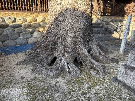五所社のクスノキ 名古屋市西区中小田井一丁目323 市の保存樹。社殿前の昭和59年頃の写真ではすでにぶつ切りされていたクスノキは、その後さらに切り詰められたようで、随分小さくなっていた。根元から見上げると、大枝の大きな切り口が目立つ。切り口の状態からすると、ここ数年内と思われた。その切り口から吹き出した枝で現在の樹冠が成り立っている。樹勢は良い。 根元を見ると、南側の根張り部分に大きな欠損が5ヶ所あり、その間に開口空洞も見られる。幹に大きな傷はない。 この社にはもう一本、立派な幹を見ることのできるクスノキがある。堤防道路から降る参道の階段すぐ右にある。 ここから少し南の堤防上、西枇杷島町との境付近にあったという幹回り3.01m樹高16mのエノキの姿はない。 |